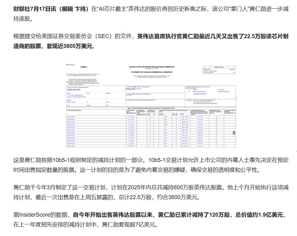 黄仁勋这话单纯只是自谦吗?似乎并没有那么简单。就在他此次来华访问之前,根据美国证券交易委员会的文件,当地时间7月15日,黄仁勋再次出售了22.5万股英伟达股票,价值约3800万美元。自今年6月份以来,黄仁勋已通过多次交易,累计出售了120万股英伟达股票,总价值约1.9亿美元。